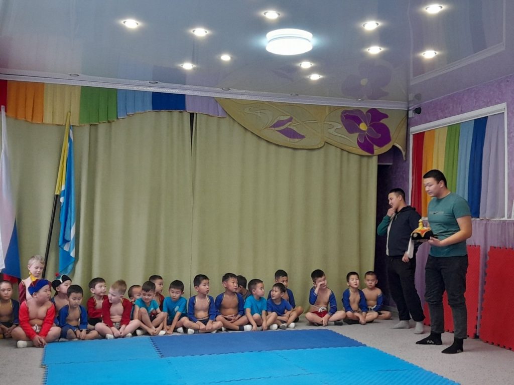 В рамках реализации ведомственного проекта «Хуреш в детские сады» нашем саду проводится секция по борьбе «Хуреш» молодым тренером Аганак Айдашовичем. Для закрепления навыков борьбы и выявления сильнейших борцов традиционно, ежемесячно проводится турнир по борьбе «Хуреш». 1 декабря состоялся второй традиционный месячный турнир среди мальчиков старших и подготовительных групп, где участвовали 20 сильнейших борцов нашего сада. Гостем сегодняшнего турнира и судьей был мастер спорта, «Чаш Арзылан моге Республики Тыва» Кунзет Ачын Арамович. В результате жарких схваток победителями среди мальчиков 5-6 лет: 1 место — Дамчын Самага (старшая группа), 2 место — Саая Айслан (логопедическая группа), 3 место — Монгуш Арат (старшая группа). Среди мальчиков 6-7 лет победителями стали мальчики логопедической группы: 1 место — Салчак Батый, 2 место — Чыпсын Чаян, 3 место — Ондар Чимит. Поздравляем наших маленьких борцов!